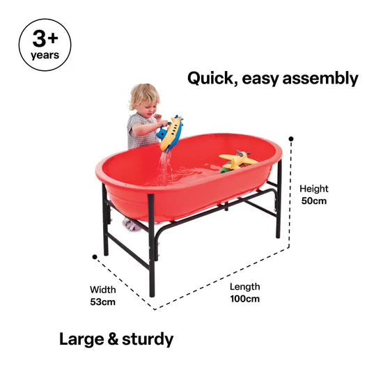 Stand and tub measures 100 x 53 x 50(H)cm. Tub measures 104(L) x 65(W) x 18(D)cm. Stand measures 95.8(L) x 50.8(W) x 51.4(H)cm. Illustrated play items not included. Assembly required. Please ensure there is constant adult supervision for the children when the tub is filled with water or other liquid.