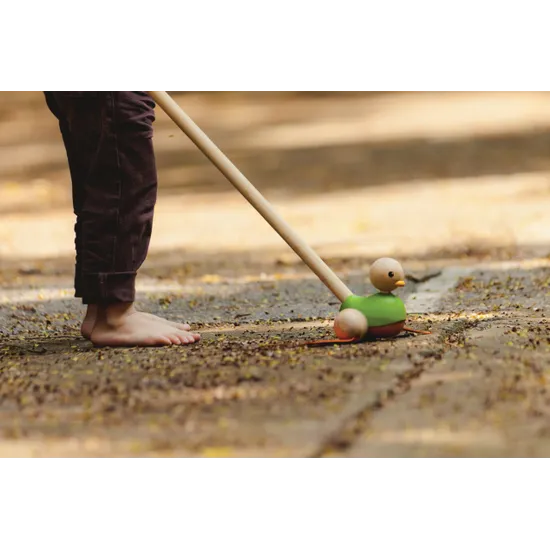 Waddle into the world of fun and learning with the PlanToys Push Along Duck - a delightful wooden companion for toddlers taking their first steps. This charming duck is more than just cute; it comes to life with every push, creating a cheerful flip-flop sound thanks to its flexible rubber feet. It's an engaging walking buddy that turns movement into a joyful adventure.