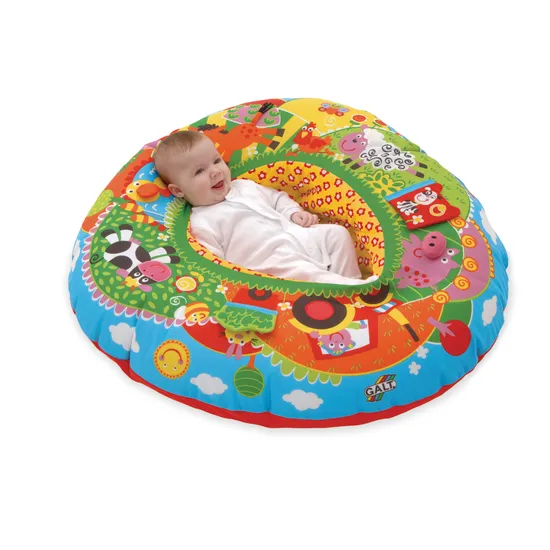 The Galt Playnest is a unique combination of a soft resting area and a self-contained play environment for babies and toddlers. This original design features a circular, fabric-covered inflatable ring that provides support for babies during rest and play. The Playnest includes eight multi-sensory features to stimulate touch, vision, and hearing, making it an excellent place for babies to sit and play with other toys while being comfortably supported. The farm-themed design adds a charming touch, making it suitable for both classroom and home environments.