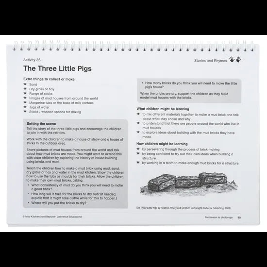 A resource book designed to inspire messy and creative play, introducing different learning concepts for outdoor mud kitchens. The book features 50 engaging activities that promote hands-on exploration, sensory experiences, and imaginative play. Each activity includes a description, suggested resources, and learning outcomes, making it an excellent guide for educators and parents.