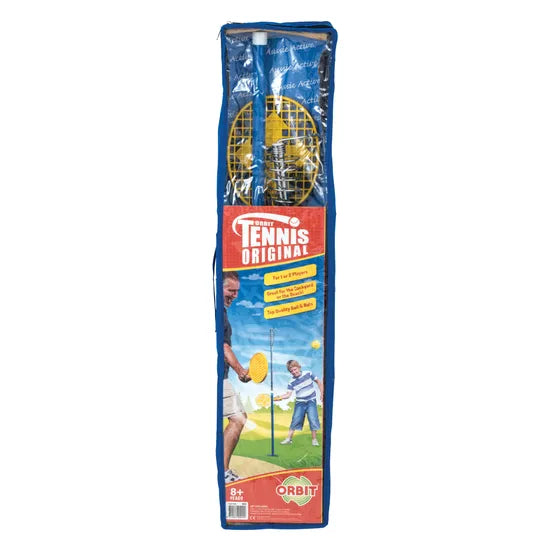 The Orbit Tennis Original is a fast-paced 2-player bat and tethered ball game that the whole family can enjoy. The set includes a powder-coated base pole, chrome-plated top pole and 2 sturdy polypropylene bats with wrist straps for added safety. The tethered Orbit Tennis Ball is attached via a nylon cord and swivel assembly for smooth, exciting play. With 2 gameplay styles and a spring for added scoring variation, the game offers hours of entertainment. Supplied in a heavy-duty zip-up bag, the set is easy to store and transport.