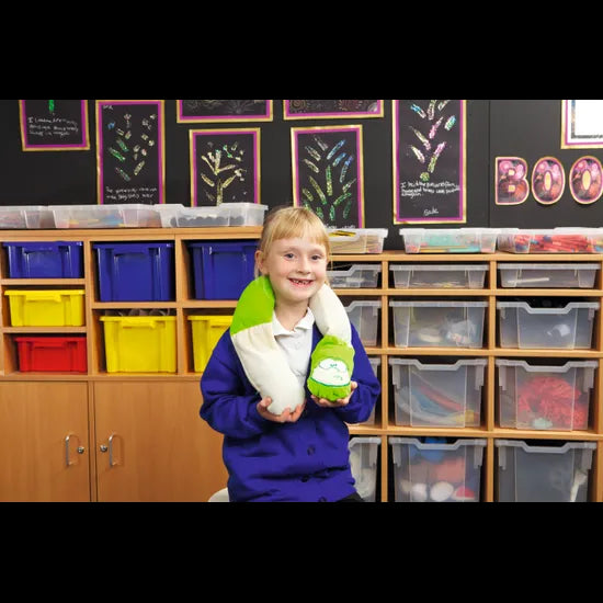 Simply place Calvin across the child's shoulders to deliver gentle, even pressure. This deep-touch input helps improve proprioception - the awareness of one's body in space - while promoting relaxation, focus, and self-regulation. Perfect for use in classrooms, therapy sessions, or at home during everyday routines such as circle time, meals, or reading. A soft, plain blue cover is included for older children who prefer a more subtle appearance. Calvin is machine washable for easy care, making it a practical and comforting resource for daily use.